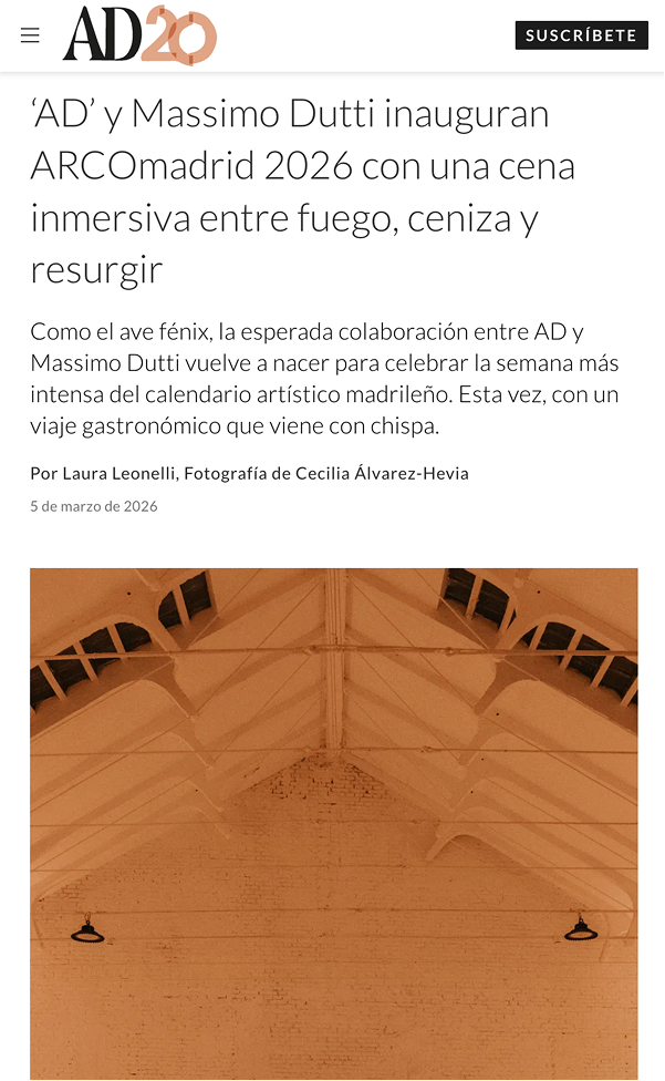 Así recogieron los medios la velada en la que AD y Massimo Dutti reunieron a un reducido grupo de invitados en el Espacio Argén. El encuentro se concibió como una experiencia inmersiva donde arte, arquitectura y gastronomía se entrelazaron bajo un mismo concepto inspirado en su stand conjunto en ARCOmadrid.