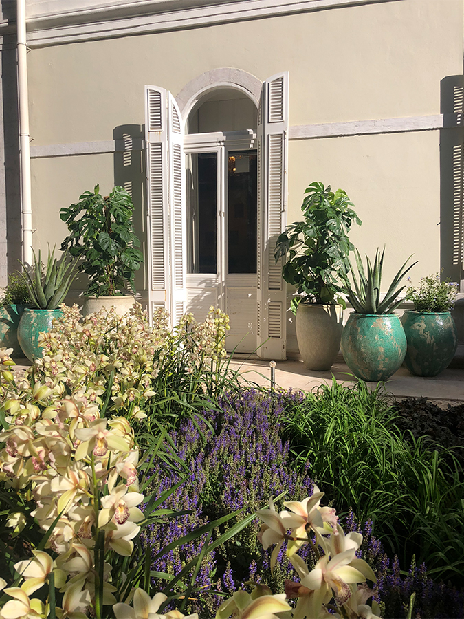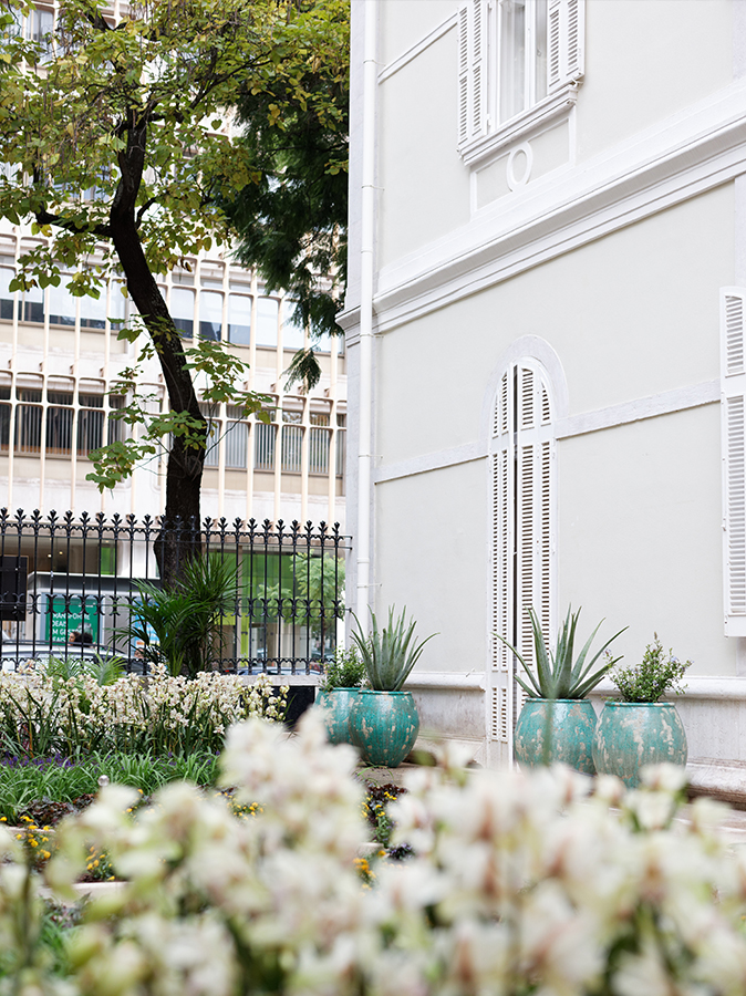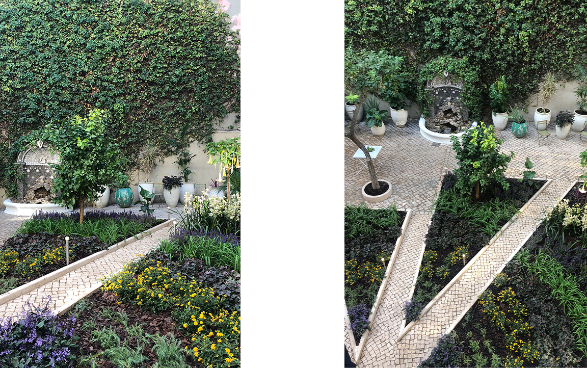 Para la conceptualización y ejecución del proyecto paisajístico implementado en el patio interior de la tienda se tuvieron en cuenta todos los factores determinantes con el objetivo de recuperar su antiguo espíritu de belleza y esplendor. Desde los estrictamente ambientales, el tipo de recipientes, la selección de las mezclas de plantación o las especies botánicas idóneas para que prosperen.