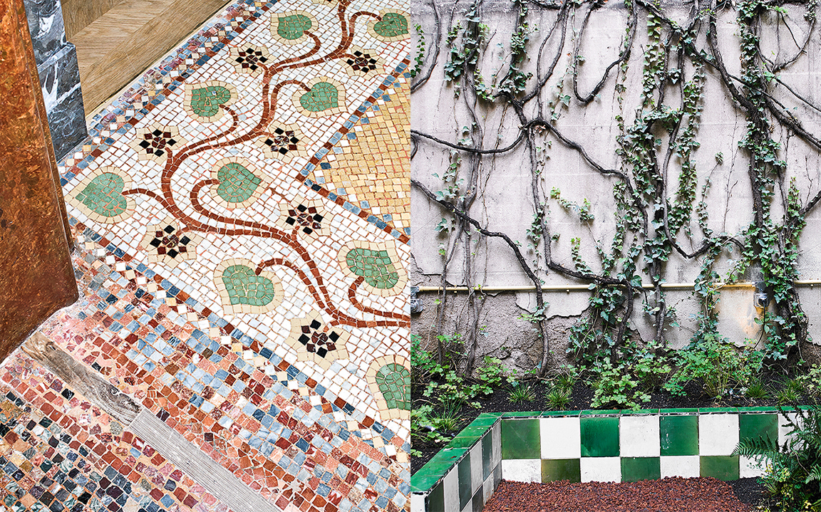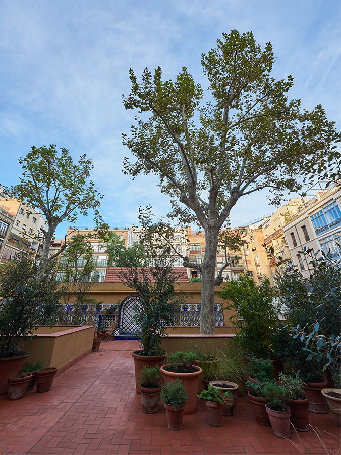 Un precioso patio interior que ha visto recuperado su antiguo esplendor habita al final de la tienda. Los prestigiosos paisajistas británicos Harry y David Rich fueron los responsables de un proyecto haute couture en comunión absoluta con las características históricas del propio edifico. Un espacio natural se despliega en un proyecto que respeta hitos de identidad del antiguo patio modernista.