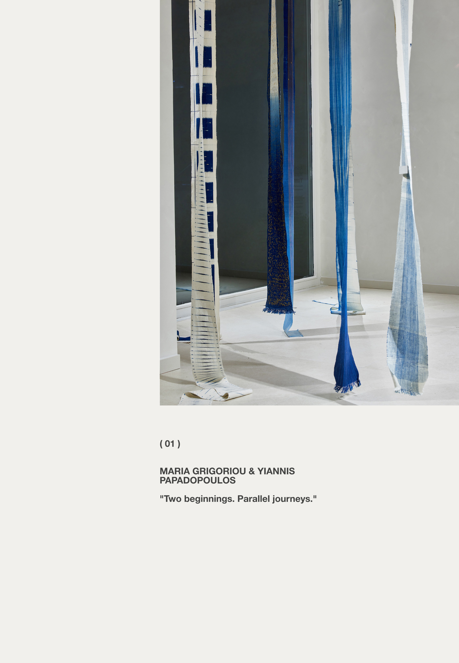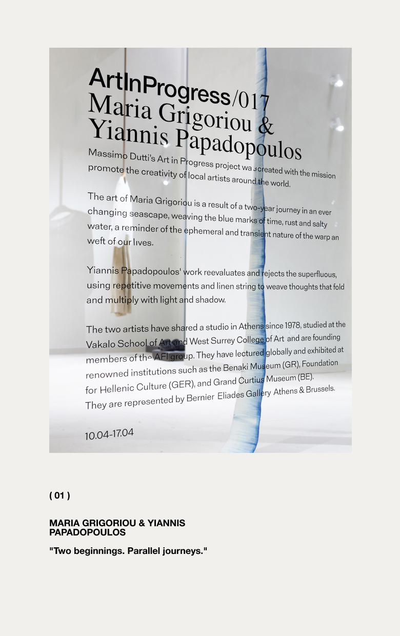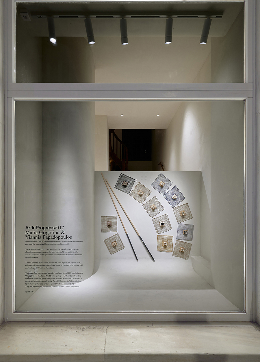 El arte de Maria Grigoriou es el resultado de un viaje de dos años en un paisaje marino en constante cambio, tejiendo las huellas azules del tiempo, el óxido y el agua salada, como un recordatorio de la naturaleza efímera y transitoria de la urdimbre y la trama de nuestras vidas. Por su parte, el trabajo de Yiannis Papadopoulos reevalúa y rechaza lo superfluo, utilizando movimientos repetitivos e hilos de lino para tejer pensamientos que se pliegan y multiplican con la luz y la sombra. Ambos artistas comparten un estudio en Atenas desde 1978 y están representados por la Galería Bernier Eliades en Atenas y Bruselas.