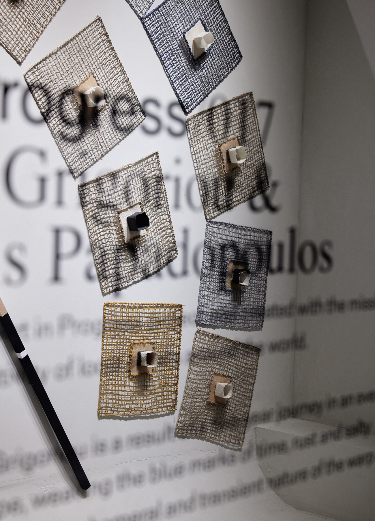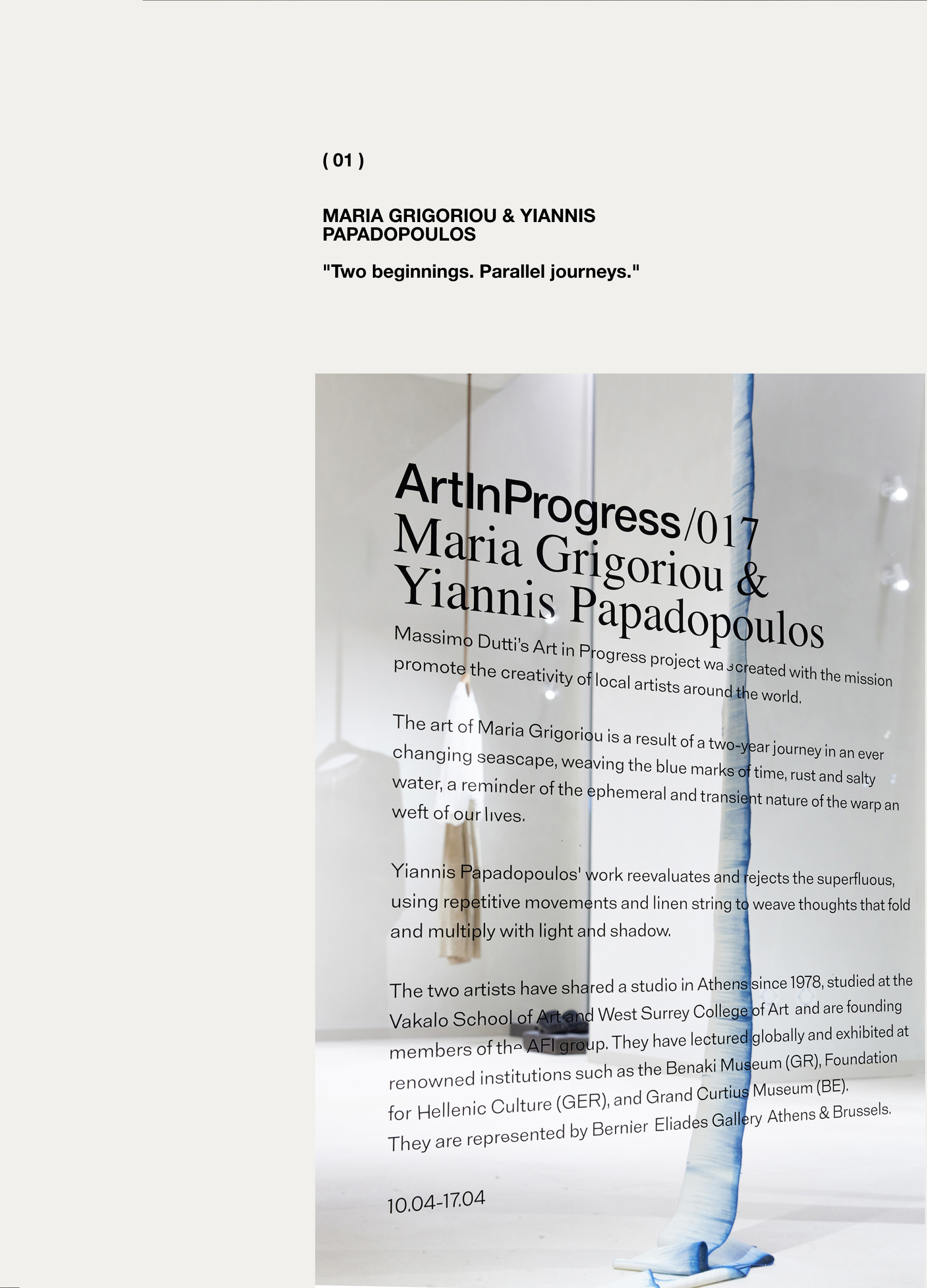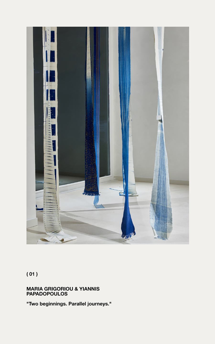 El arte de Maria Grigoriou es el resultado de un viaje de dos años en un paisaje marino en constante cambio, tejiendo las huellas azules del tiempo, el óxido y el agua salada, como un recordatorio de la naturaleza efímera y transitoria de la urdimbre y la trama de nuestras vidas. Por su parte, el trabajo de Yiannis Papadopoulos reevalúa y rechaza lo superfluo, utilizando movimientos repetitivos e hilos de lino para tejer pensamientos que se pliegan y multiplican con la luz y la sombra. Ambos artistas comparten un estudio en Atenas desde 1978 y están representados por la Galería Bernier Eliades en Atenas y Bruselas.