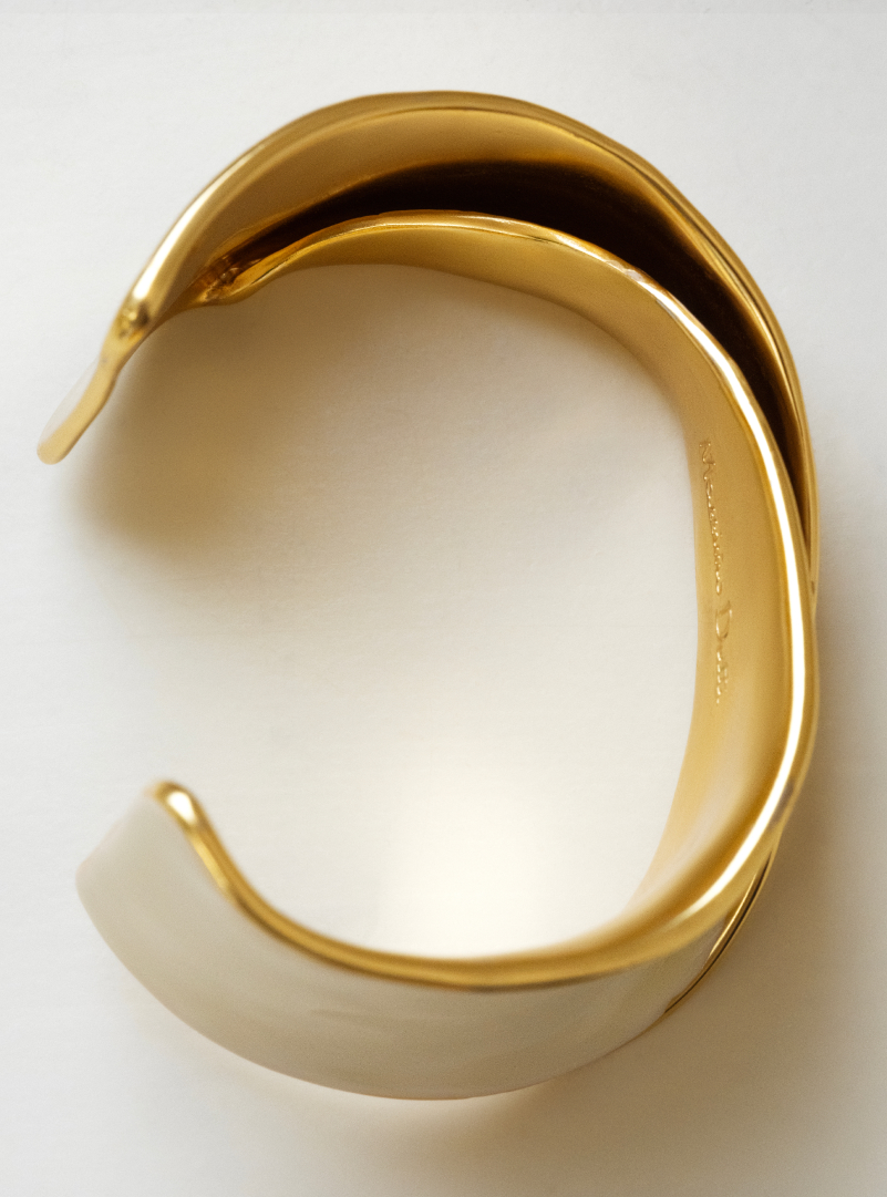 Piezas como este brazalete de una pieza dejan paso a una nueva modalidad de lucir las joyas: en clave maxi y a poder ser con acabado reluciente dorado.