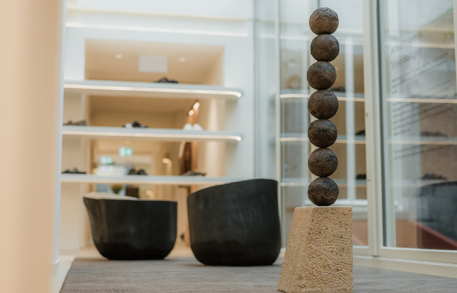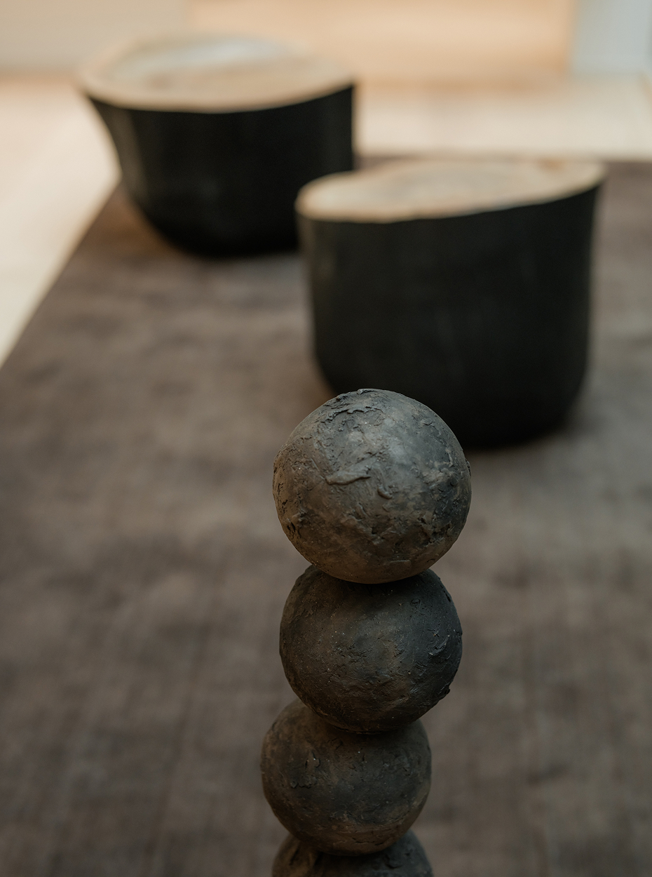 Yoyo Balagué crea obras que transmiten el lenguaje de la tierra. La naturaleza habla en fracturas, asimetrías y la suave erosión del tiempo. Las Esferas de Balagué visualizan la gravedad, la trascendencia y la universalidad, y están hechas de arcilla de terracota cocida al humo con grog grueso y cerámica construida a mano con algas y madera flotante. La propia arcilla cuenta una historia geológica: roca arenisca formada a lo largo de muchos años bajo la superficie de océanos, lagos o ríos.