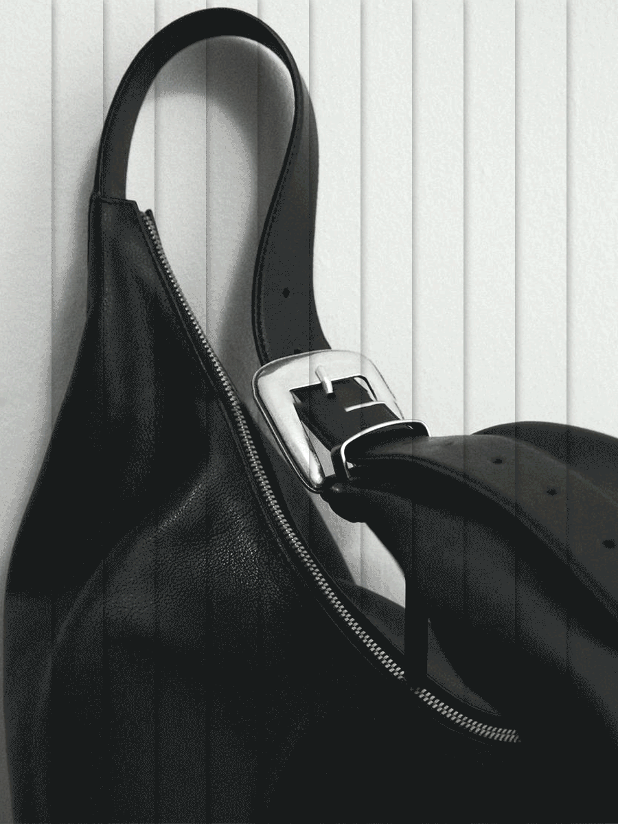 Bolso de piel con acabado serraje, cierre de cremallera y asa regulable con hebilla. Un diseño versátil que equilibra funcionalidad y estilo contemporáneo.