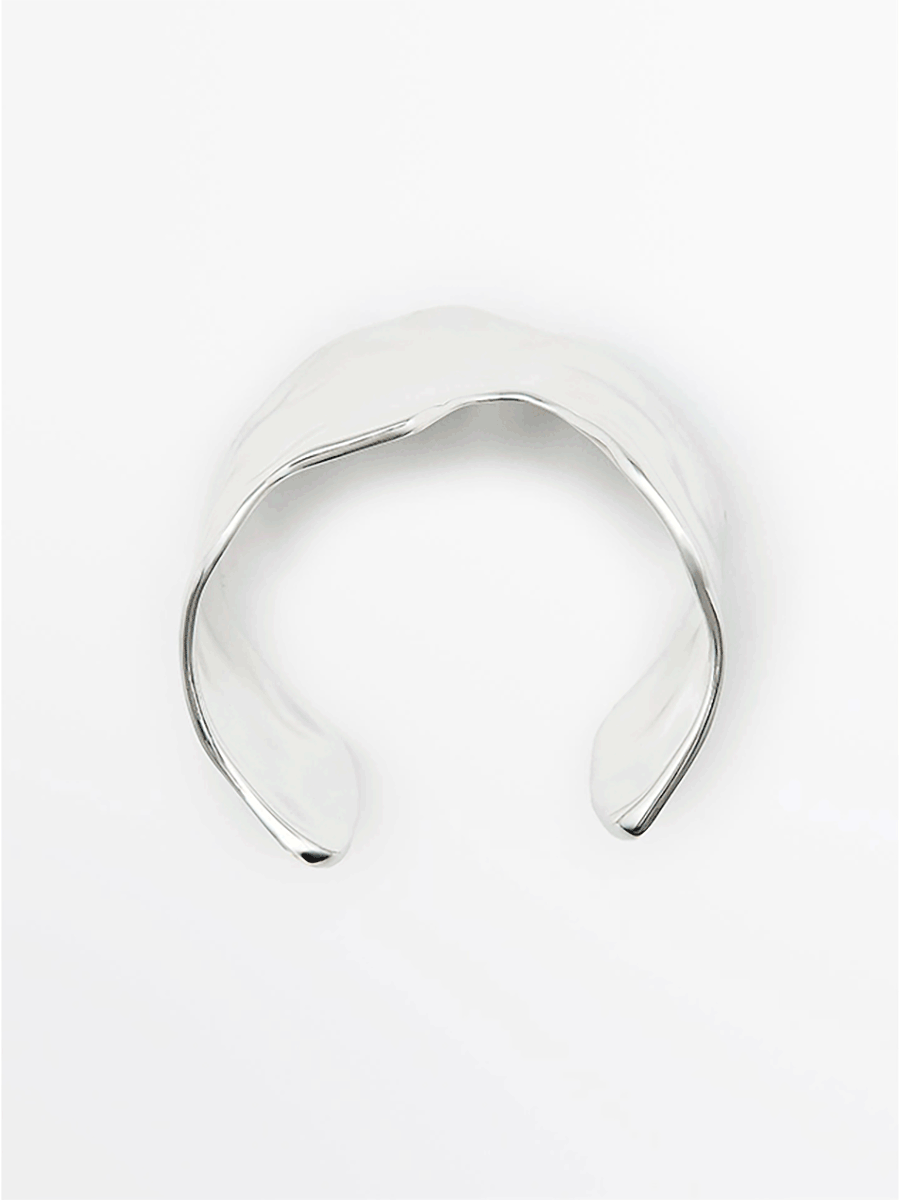 Con formas esculturales, y una abertura sutil, esta pulsera de plata ancha con diseño irregular y sutil abertura redefine la elegancia contemporánea con una estética moderna.