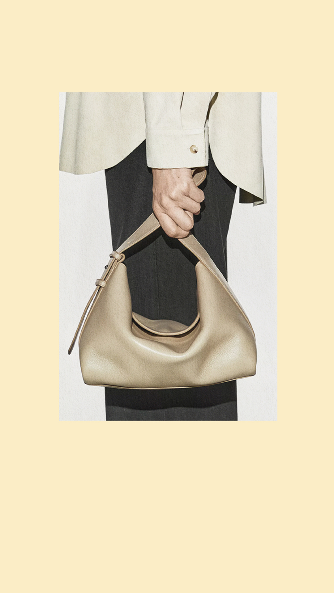 Un bolso de líneas arquitectónicas: sostiene el gesto, define la silueta y acompaña el movimiento. Su diseño discreto y proporciones cuidadas lo convierten en un objeto cotidiano con vocación de permanencia, concebido como un esencial contemporáneo.
