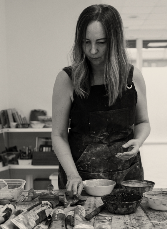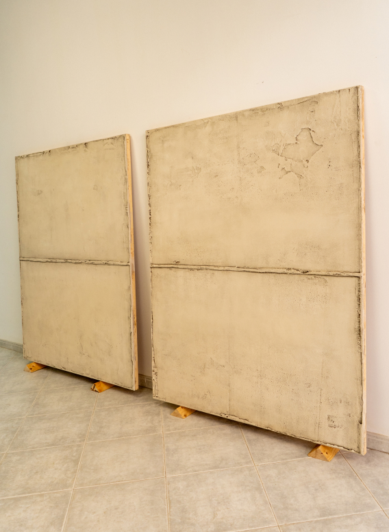 Las pinturas de Antonia Ferrer desdibujan la línea entre escultura y pintura, utilizando materiales primitivos y técnicas gestuales para crear superficies texturadas que exploran la interacción entre luz, sombra y color. Artista representada por la Galería Alzueta.