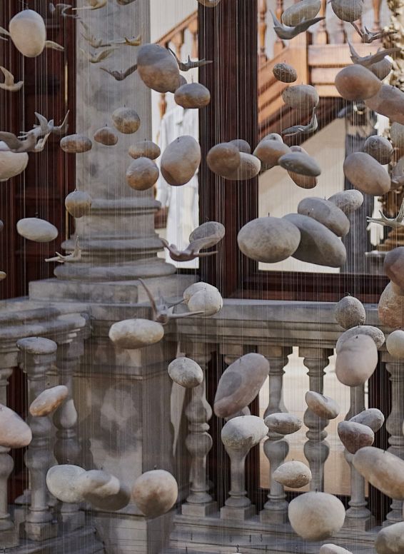 Titulada “Los Huesos de la Tierra” la instalación de Pamen Pereira que se puede visualizar en la tienda de Massimo Dutti en Paseo Gracia está representada por una cascada de piedras de porexpan recubiertas de cemento y envejecidas en la que una a una crea un efecto de suspensión en el espacio.