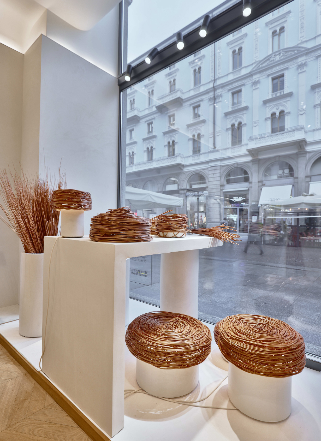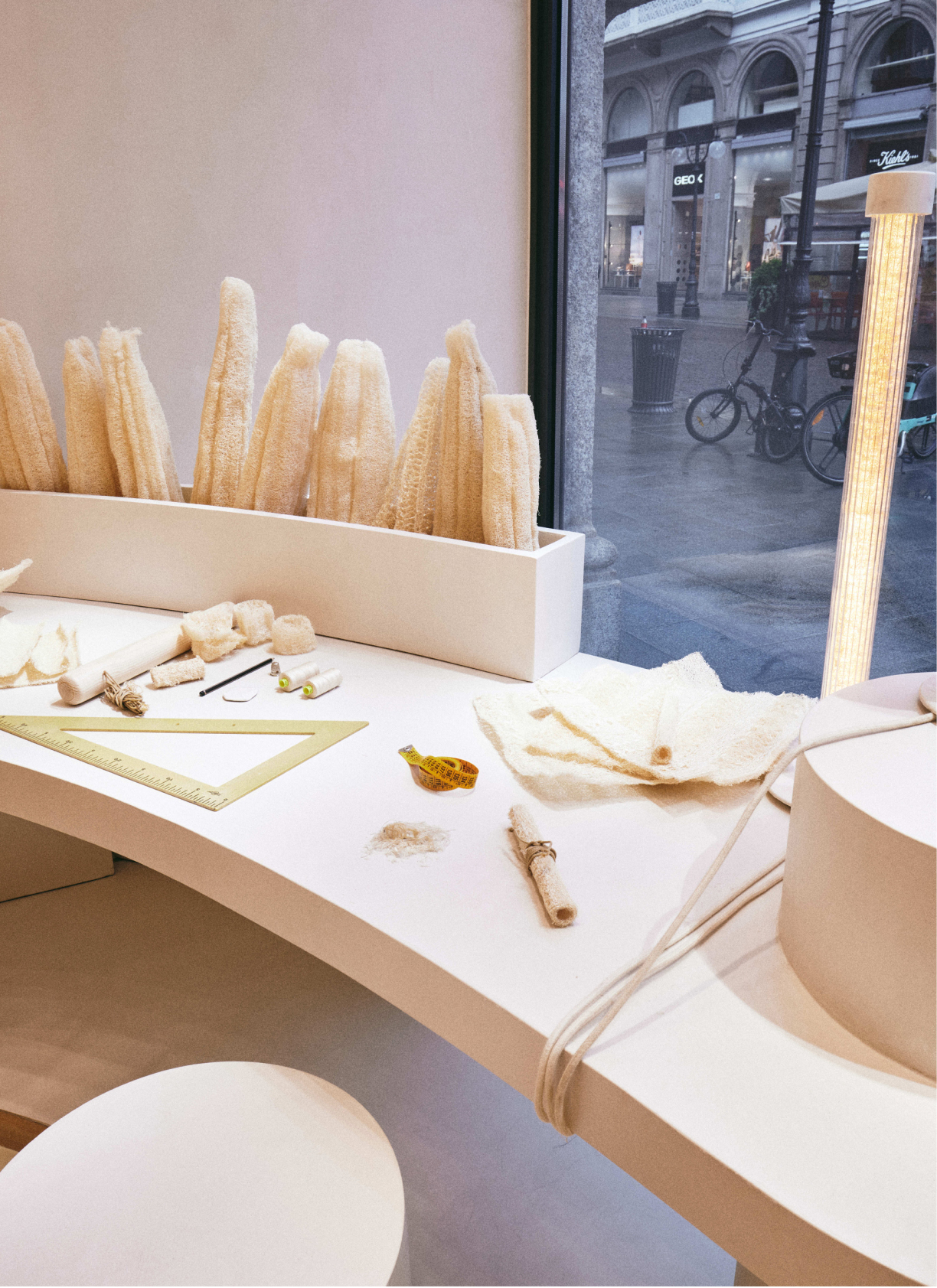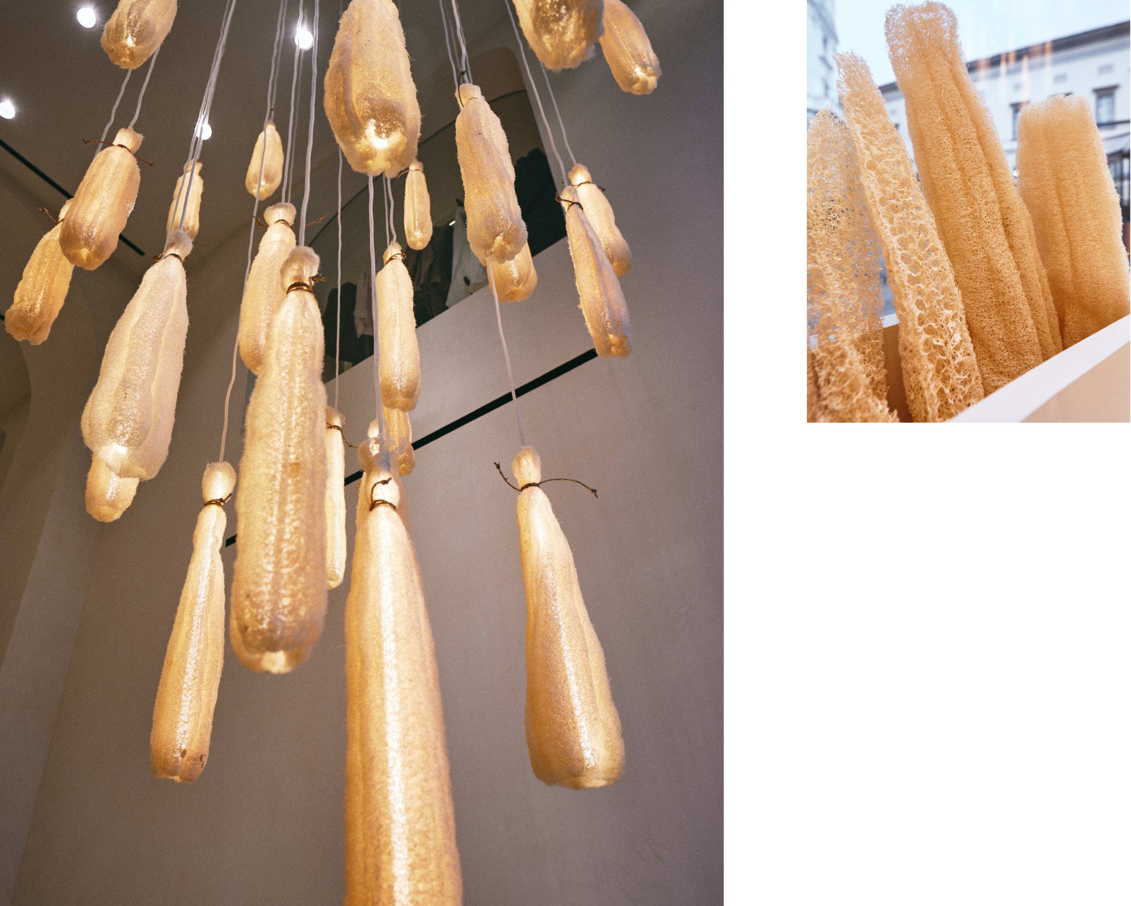 Las piezas con loofah, una planta trepadora de origen tropical, consisten en unas pantallas de lámpara que tamizan la luz. Una lámpara con pantallas de loofah pendía del techo de uno de los escaparates a modo de instalación efímera.
