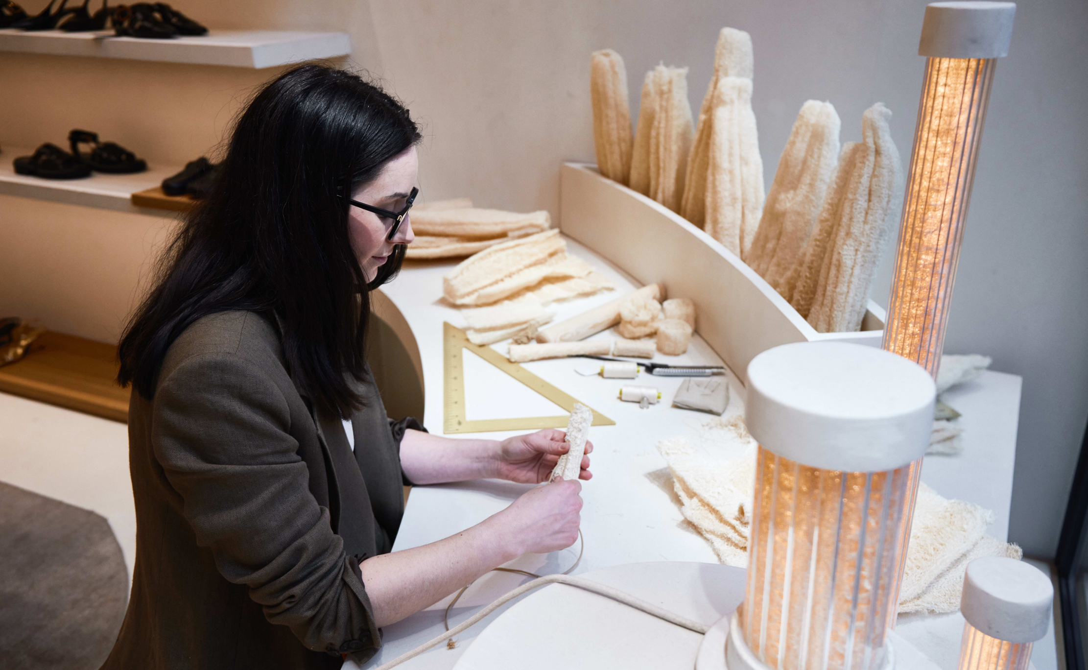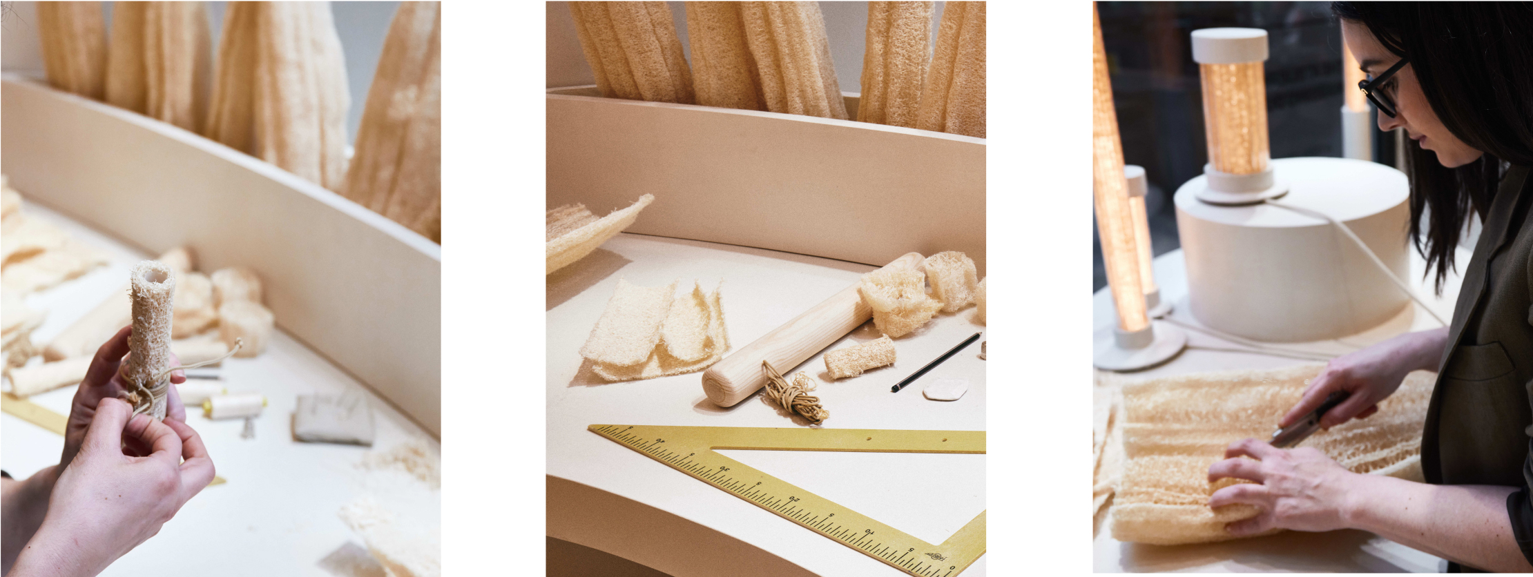 Las piezas con loofah, una planta trepadora de origen tropical, consisten en unas pantallas de lámpara que tamizan la luz. Una lámpara con pantallas de loofah pendía del techo de uno de los escaparates a modo de instalación efímera.