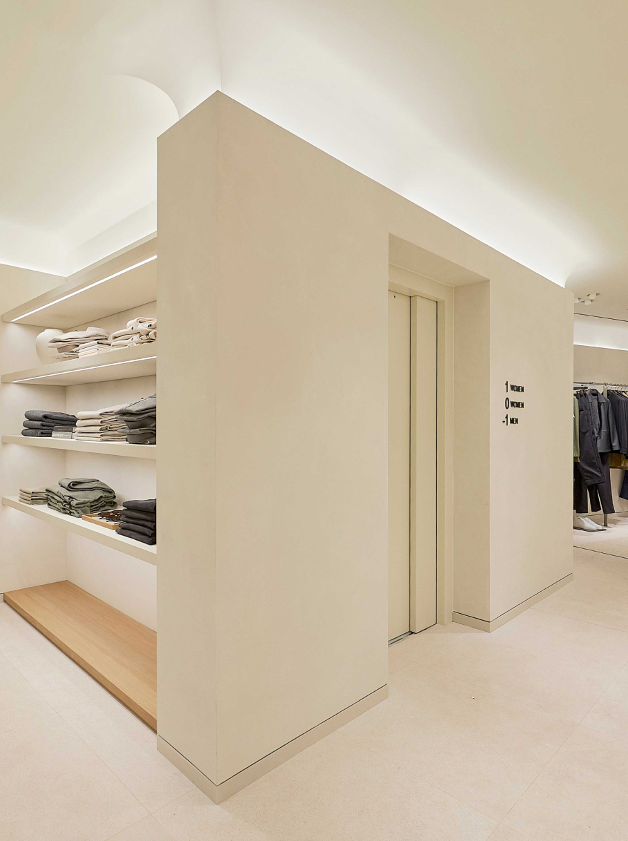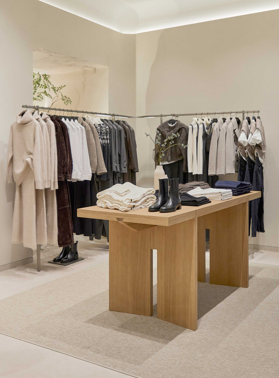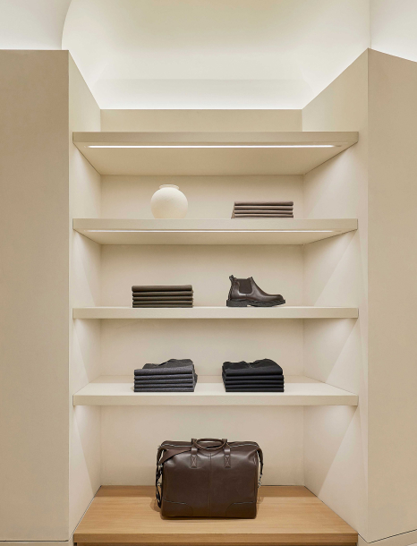 La propia arquitectura de la tienda va creando el mobiliario y definiendo los corners. Maderas macizas, piedras naturales y encalados forman parte de la esencia de la marca. Las nuevas tiendas Massimo Dutti responden al concepto más avanzado de ecoeficiencia del Grupo Inditex, reduciendo el consumo eléctrico y el de agua.